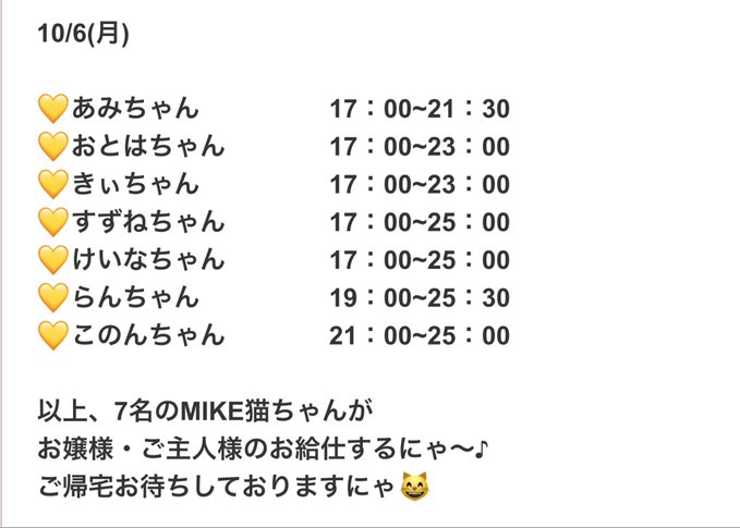 MIKECAFE(ミケカフェ)@MIKE_NOMINE·7時間すみません、、、直しますにゃ( ;∀;)引用らん@mikecafe_ran·7時間魔導士さんへ 流石のらんでも閉店後まで1人で お給仕はしませんよ(̨̡🐾 ◜𖥦◝)̧̢ ゆうきさんからの悪魔のような メッセージで気付きました🔚 ということで本日19-25います😞7991