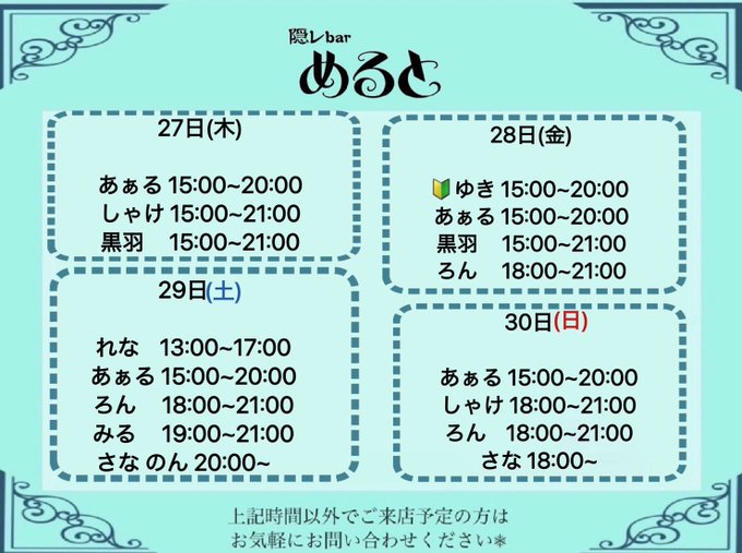 広島 隠レbarめるとさなぱっちょ@Sana_pa_37·1時間今週は 土曜日 さな&のん 日曜 さな です! 日曜の出勤が早くなるかも?? またお知らせします📢引用隠レbar めると@kakurebar_melt·11月24日11月30日(日)迄の鍵開け予定表になります 🗝️🫧 🧊 キャストの出勤=お店のオープン時間♡ 🔰のキャストは、まだお仕事を覚えてる最中の見習いちゃんです🌙 心ばかりのご奉仕で…10分多めにお時間サービスさせていただきます💐 ※時間は前後することがあります!各キャストのSNSをチェックしてね📱 x.com/kakurebar_melt…1161