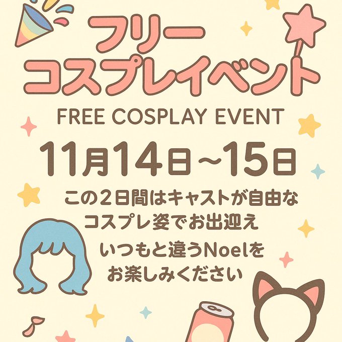 広島 メイドラウンジNoe'lにこちฅ^•ω•^ฅさんがリポストコンセプトラウンジ Noel@Noel_Hiroshima·🌟本日フリーコスプレイベント🌟 お待ちしております🙇♂️🙇♀️22460